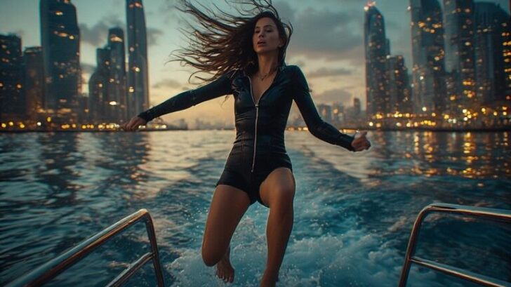 A lady dressed in a sleek black zip-up wetsuit top and black shorts stepped onto the yacht deck like she owned the ocean itself. The wind caught her outfit just enough to give her that “main character in an action movie” energy.